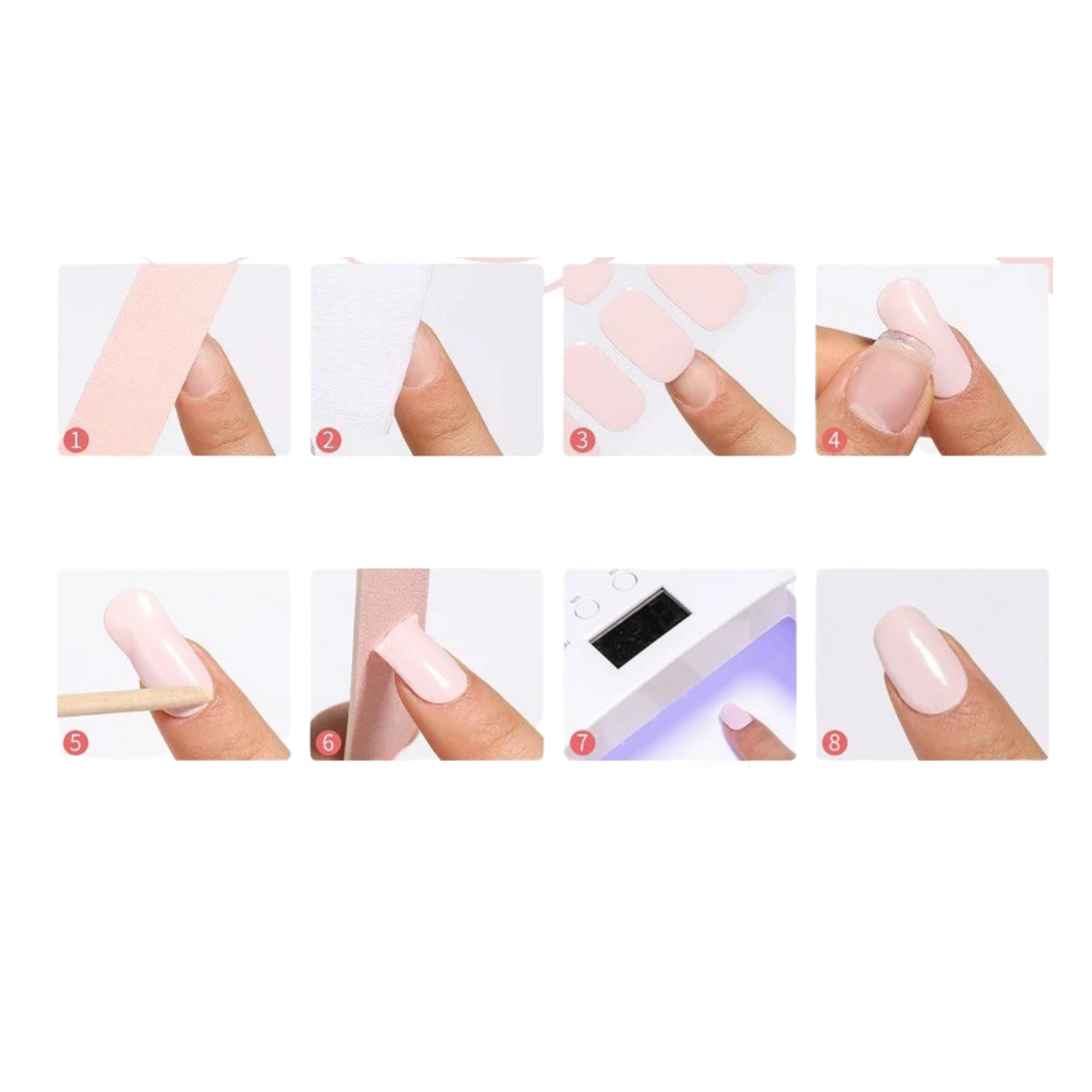 • Tırnak kökünle arasında hafif bir boşluk bırakarak şeridi tırnağına iyice yapıştır. Önemli: Kenarlara iyice bastırarak şeritlerin takılmasını önleyebilir, daha uzun süre kalıcı olmasını sağlayabilirsin.